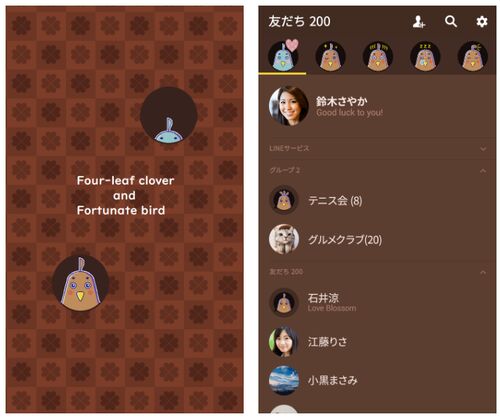 LINE着せかえ/四つ葉のクローバーと幸運な鳥 四つ葉のクローバーと幸せを見つける鳥の着せかえです♪ チョコレート色の鳥が実は青い鳥だった…。バレンタインをイメージしました。ブラウン・茶色がお好きな方へ。
