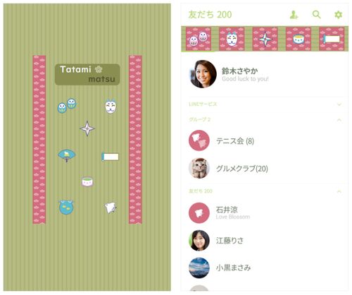 LINE着せかえ/たたみ■市松&武田菱 市松(いちまつ)と武田菱(たけだびし)文様の畳のLINE着せかえです♪ タタミ、和柄模様、和風小物、緑・白・桃色(グリーン・ホワイト・ピンク)がお好きな方へ。