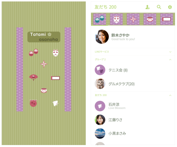 麻の葉文様の畳のLINE着せかえです♪ タタミ、和柄模様、和風小物、緑・白・薄紫色(グリーン・ホワイト・ライトパープル)がお好きな方へ。